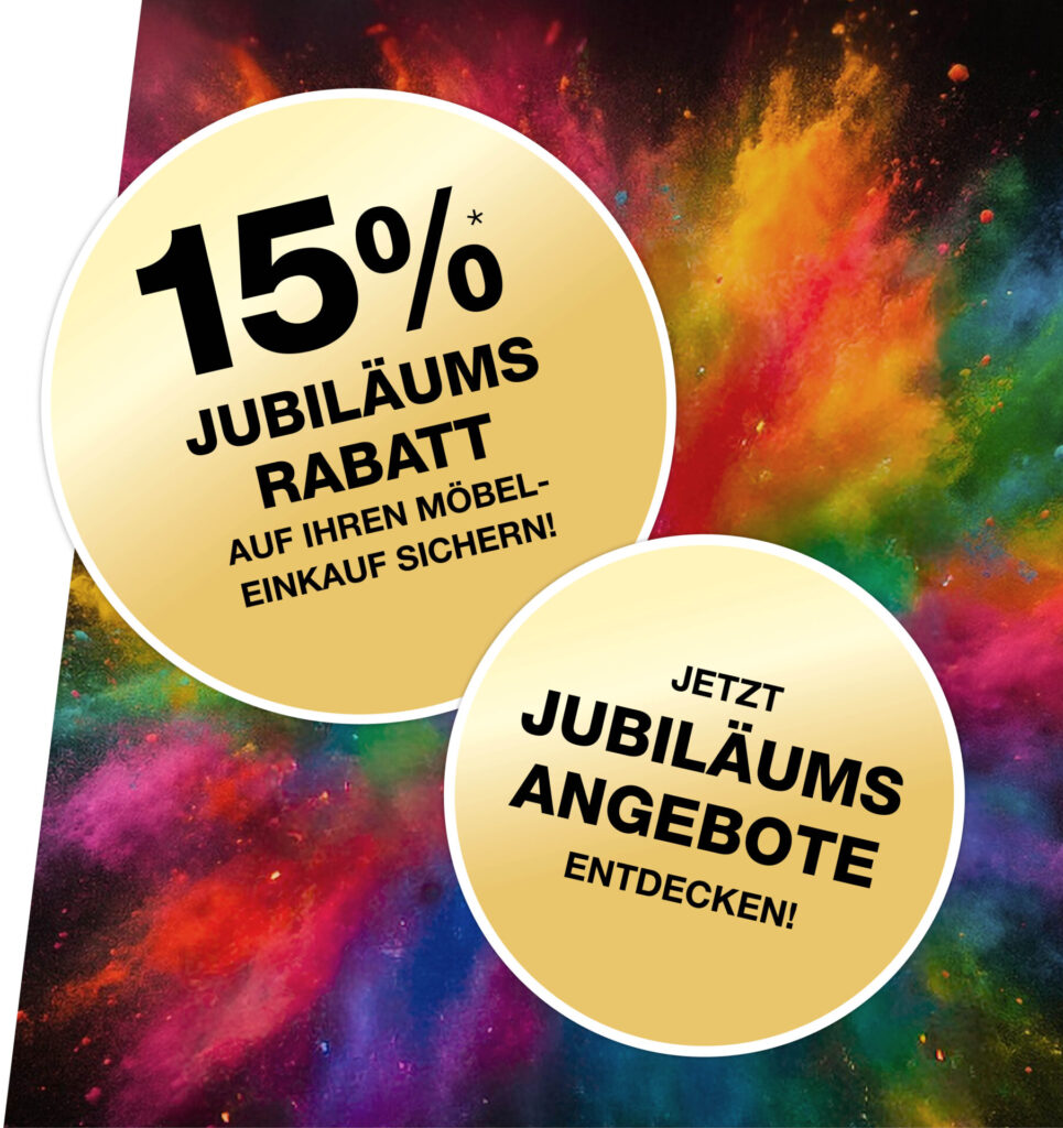 Feiern Sie mit uns! Als Zeichen unserer Wertschätzung schenken wir Ihnen 15 % Jubiläums-Rabatt auf Ihren Möbeleinkauf. Darüber hinaus erwarten Sie zahlreiche exklusive Jubiläums-Angebote, die wir speziell für diesen Anlass zusammengestellt haben.